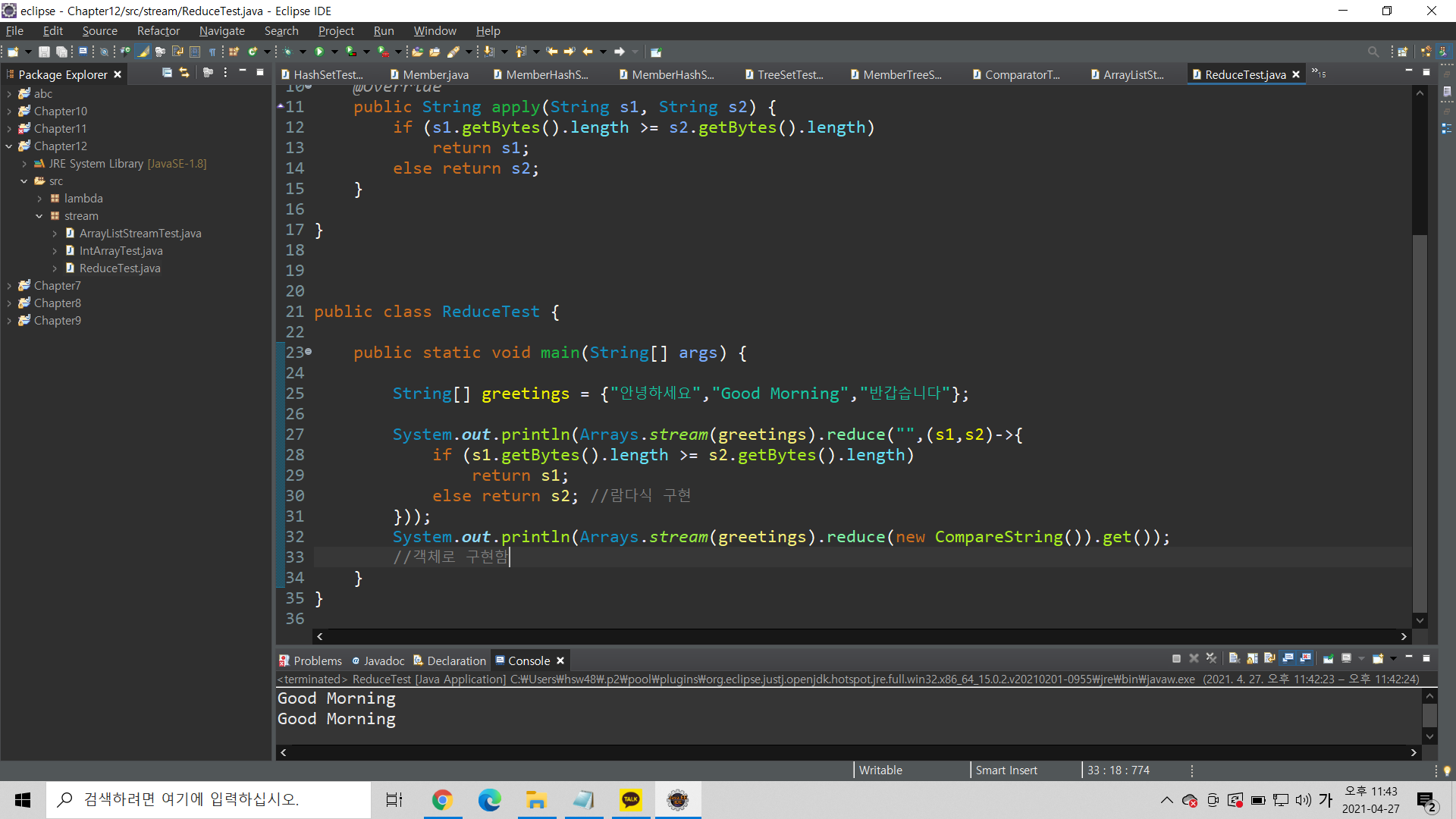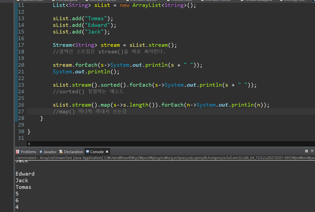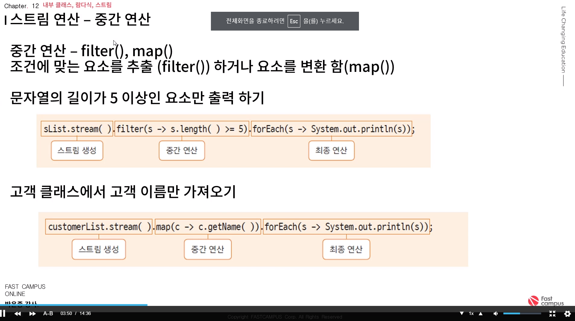스트림에 구현부는 람다식으로 쓰이고 있다 (사진참조)