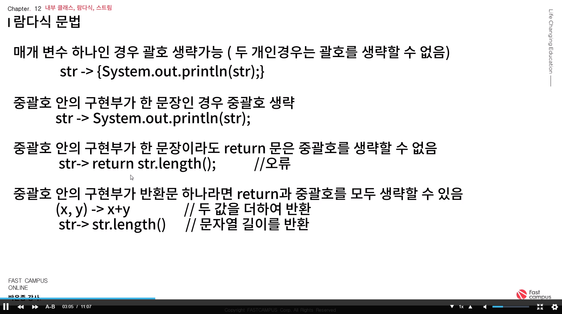 *중괄호 안의 구현부가 반환문 하나라면 return과 중괄호를 모두 생략할 수 있음