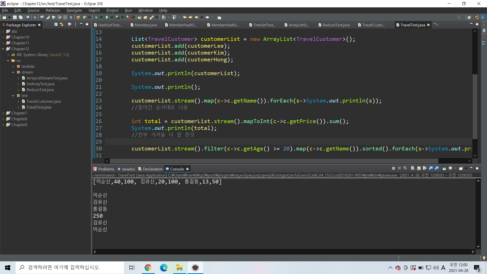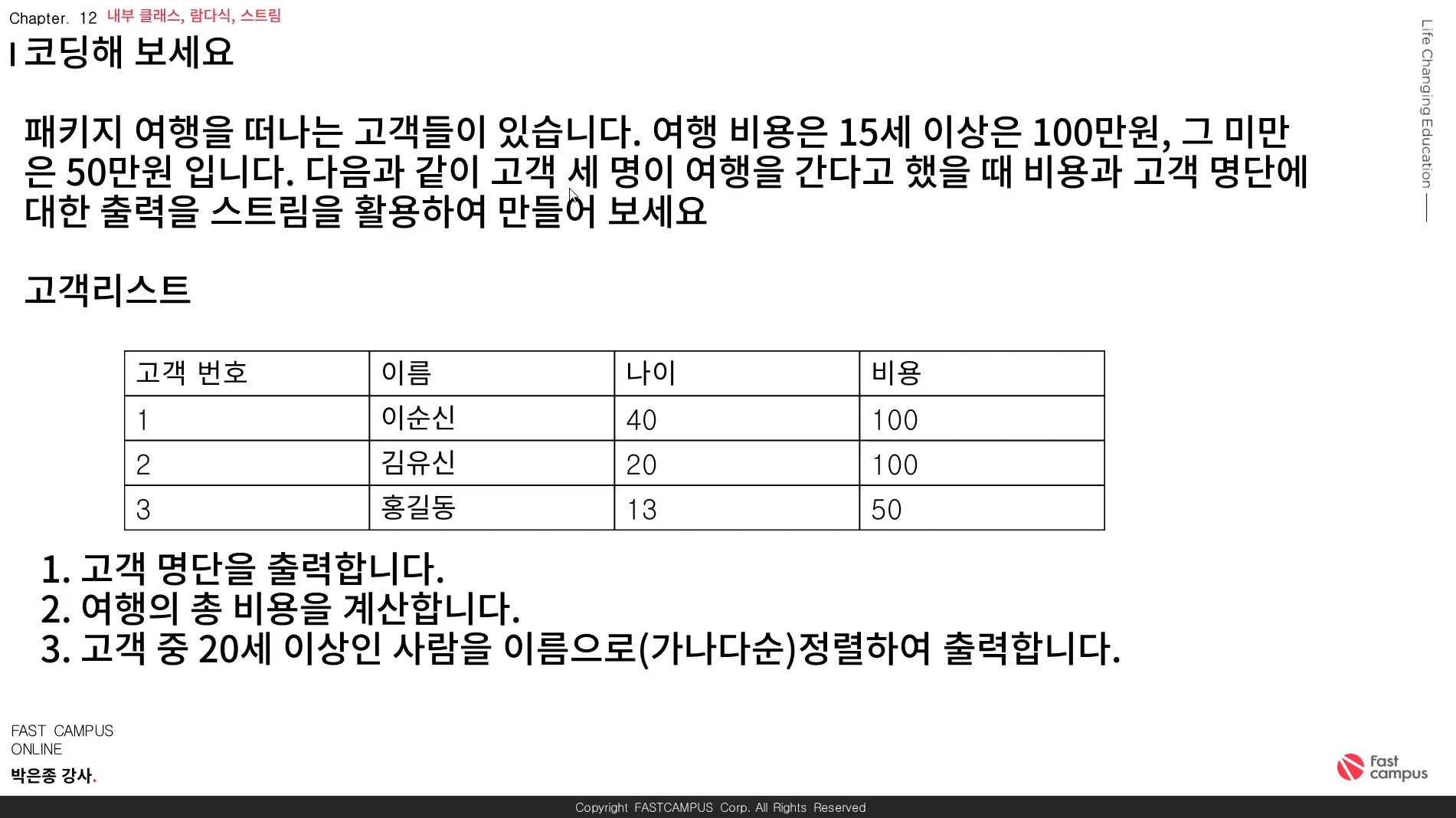 여행을 간다고 했을 때 비용과 고객 명단에 대한 출력을 스트림을 활용하여 만들어 보세요