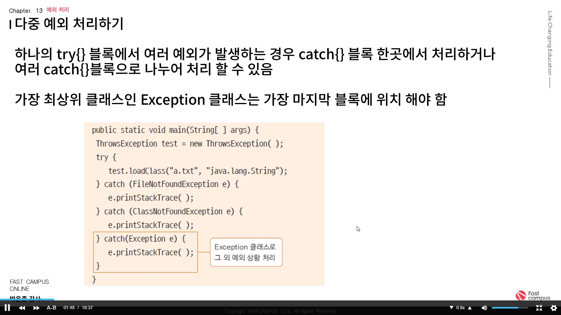 가장 최상위 클래스인 Exception클래스는 가장 마지막 블록에 위치 해야 함