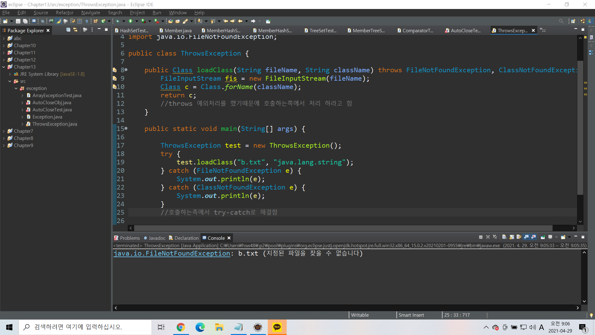 try{} 블록으로 예외를 처리 하지 않고, 메서드 선언부에 throws 를 추가