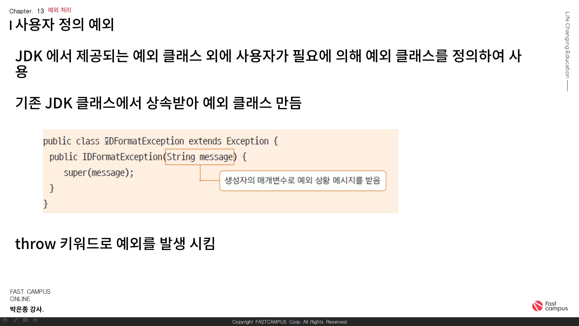 JDK에서 제공되는 예외 클래스 외에 사용자가 필요에 의해 예외 클래스를 정의하여 사용