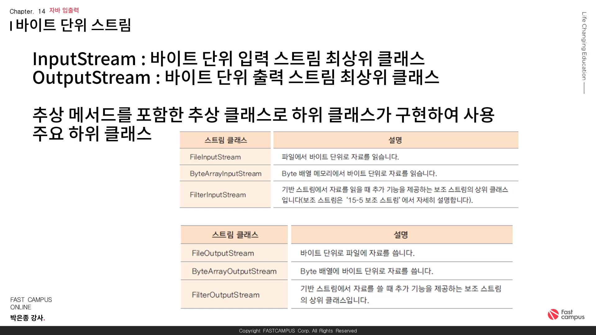 InputStreamReader 와 같은 보조 스트림을 사용해야 함