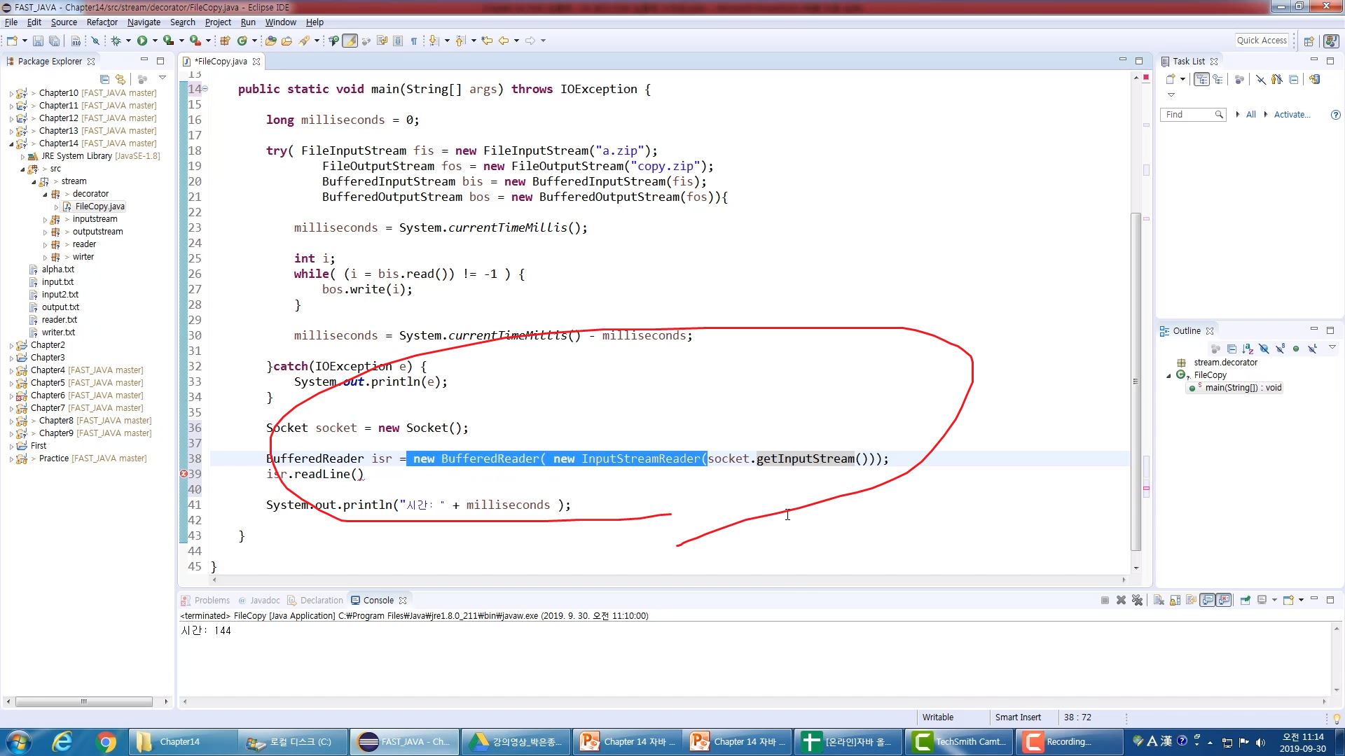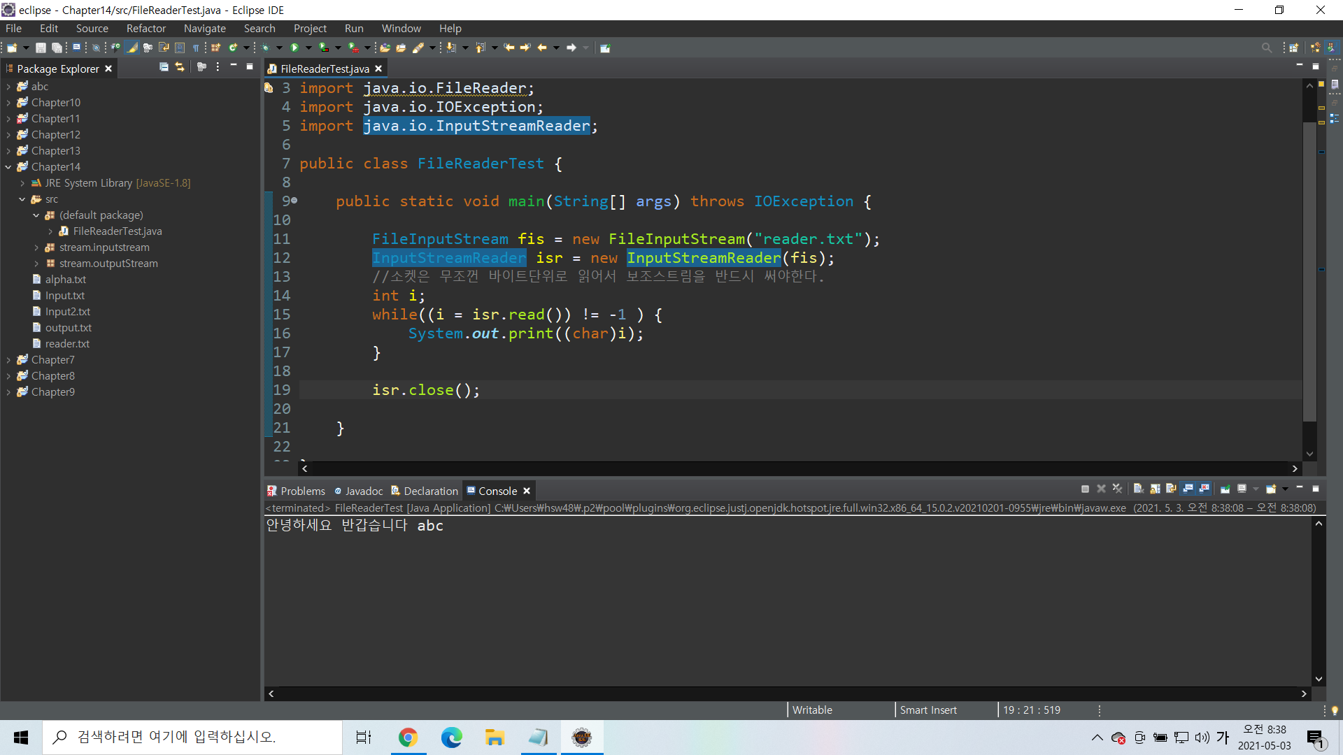 FileReader, InputStreamReader,BufferedReader (8k 정도 되는 내부 버퍼를 가지고 있어 속도가 빨라진다)