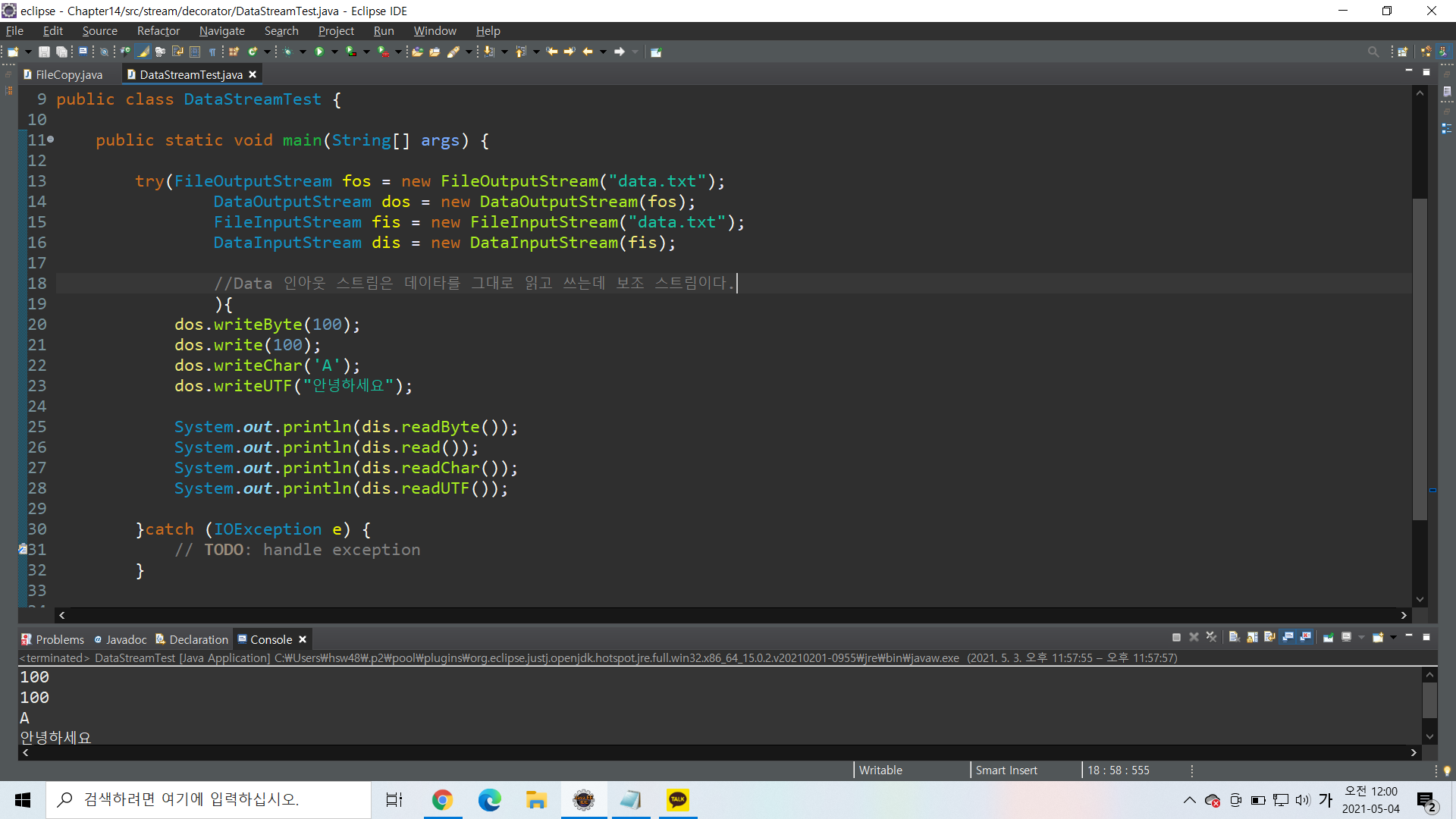 DataInputStream / DataOutputStream : 자료가 저장된 상태 그대로 자료형을 유지하며 읽거나 쓰는 기능을 제공하는 스트림