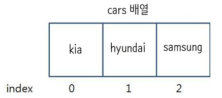 cars[0] = "kia"; // 0번째 인덱스에는 kia 값을 저장