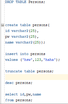 * Oracle SQL Developer로 실행하면 결과는 아무런 정보가 없는 persons 테이블만 남는다