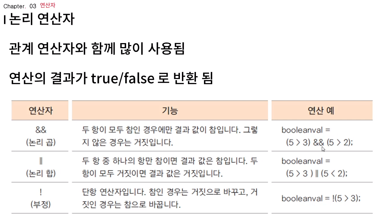 ! (부정) - 단항 연산자 입니다. 참인 경우는 거짓으로 바꾸고, 거짓인 경우는 참으로 바꿉니다.