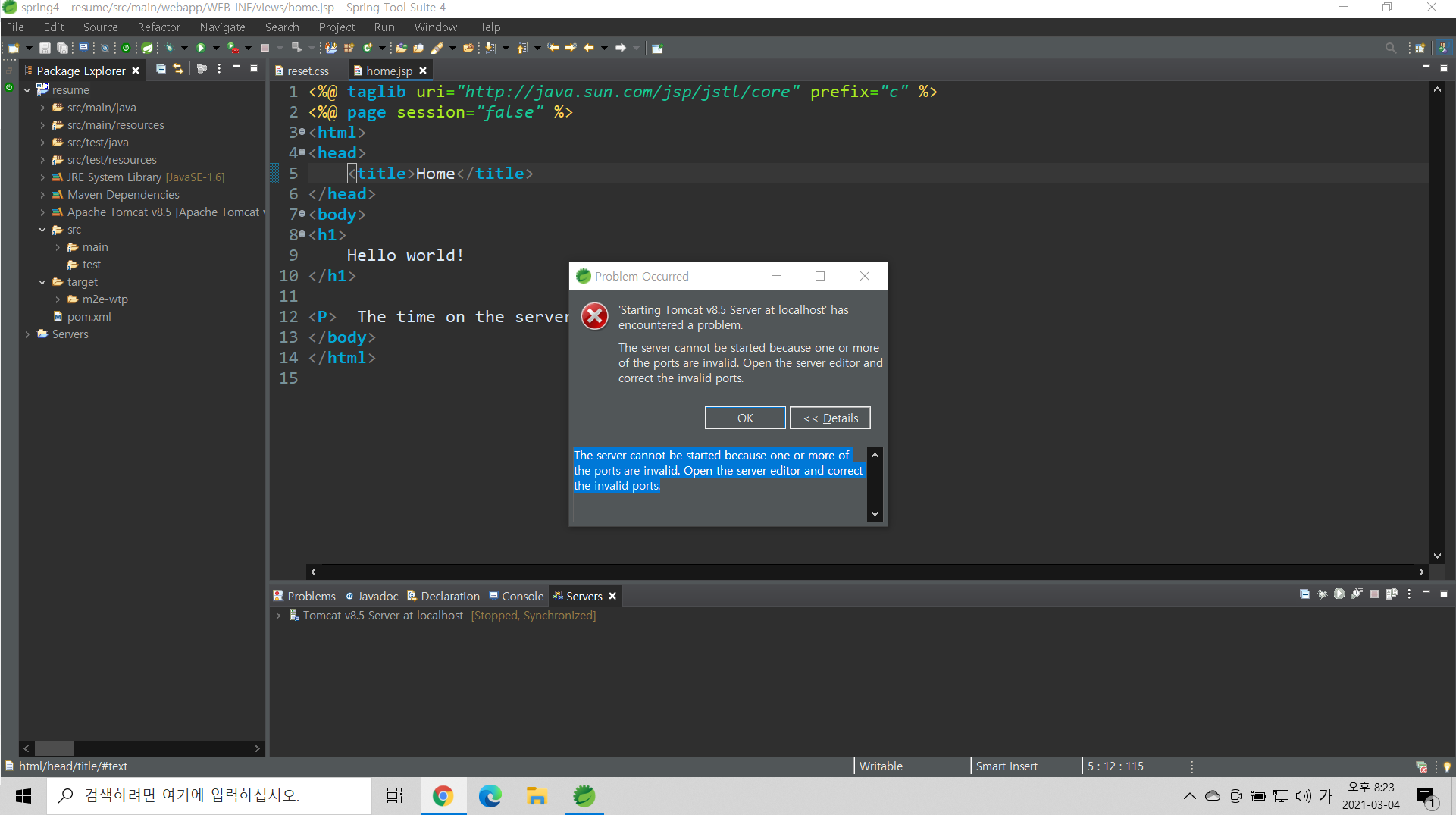 [톰캣 서버 오류] The server cannot be started because one or more of the ports are invalid. Open the server editor and correct the invalid ports.
