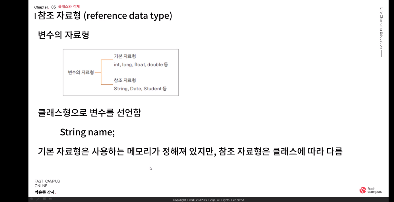 기본자료형은 사용하는 메모리가 정해져 있지만, 참조 자료형은 클래스에 따라 다름