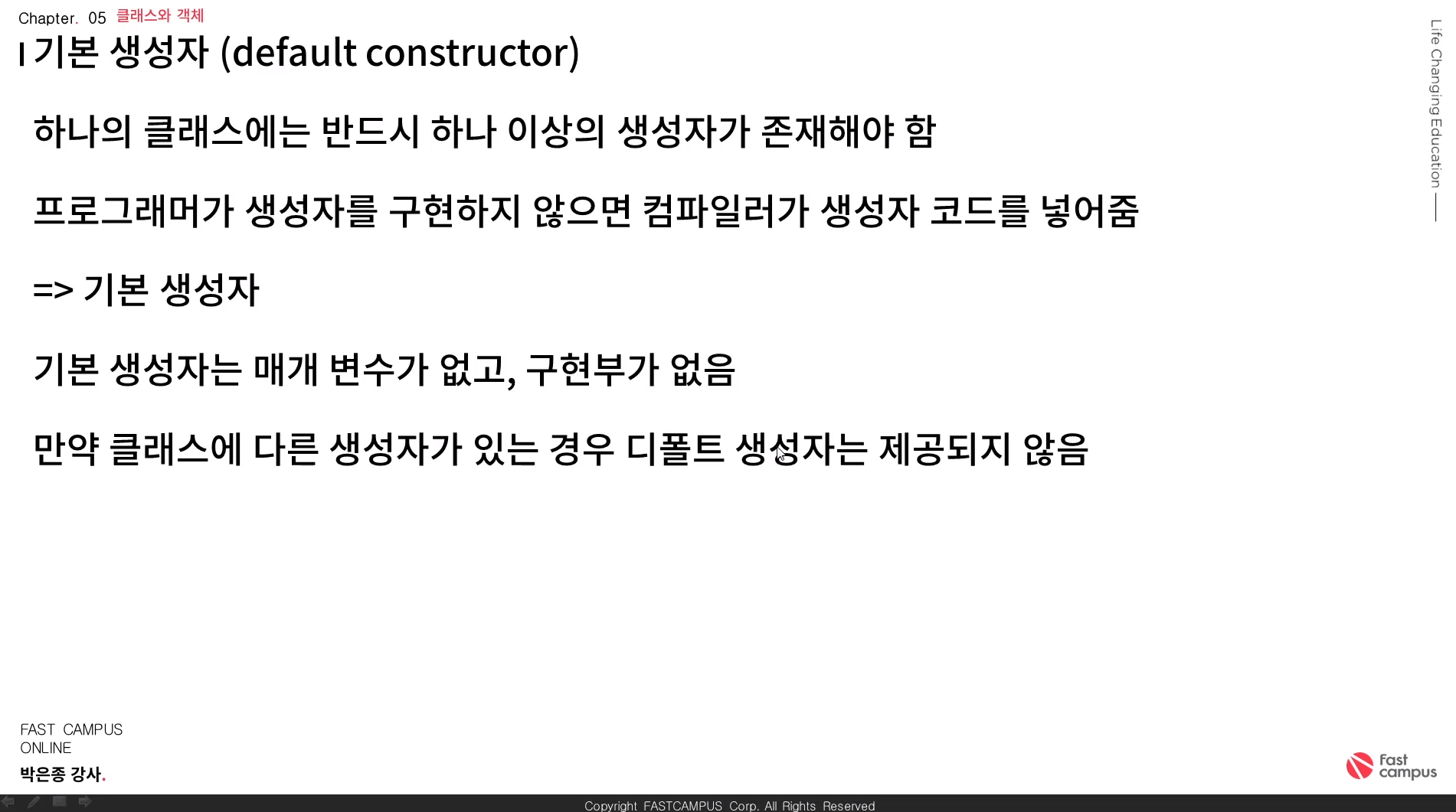 하나의 클래스에는 반드시 하나 이상의 생성자가 존재해야 함