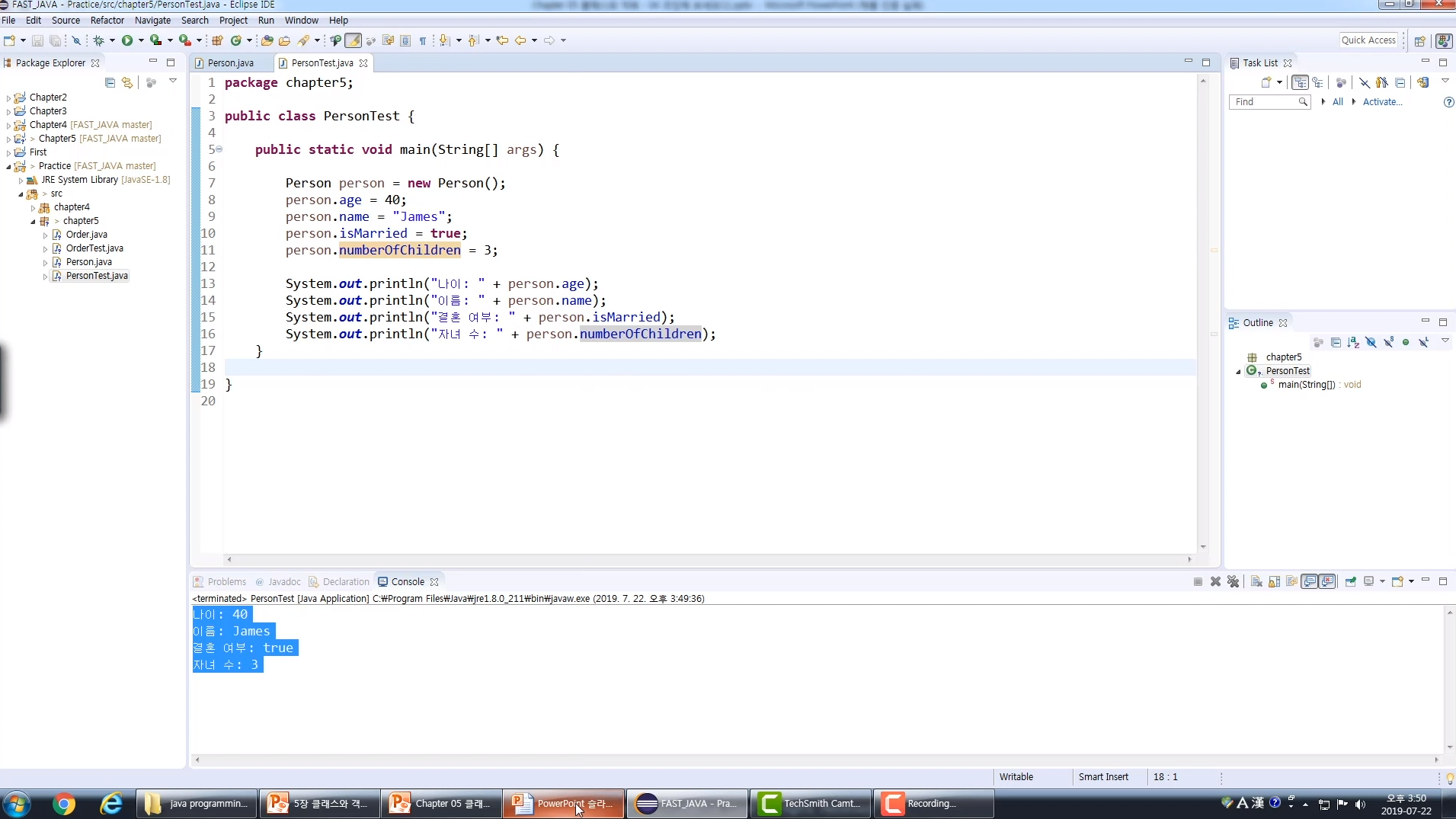 class에 age, name, isMarried, numberOfChildren 이라는 멤버변수를 만들고 메인 클래스에 출력하면 된다.