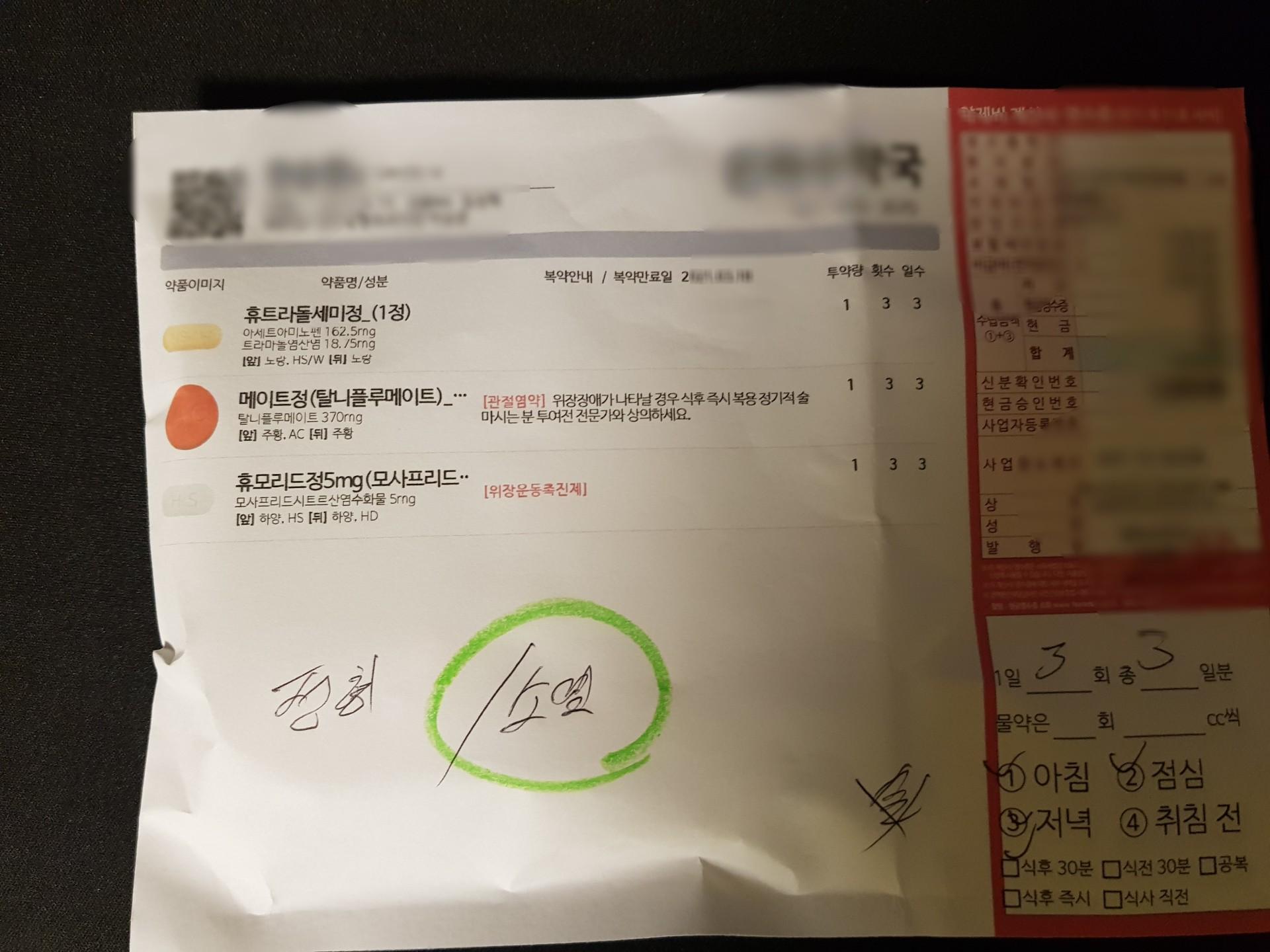 진료는 약 1분(?) 봤다. 건설현장에서 무거운거 들다가 삔 것 같다고 하니깐 의사선생님이 손목염좌라고 하시면서 일주일정도 일을 쉬라고 하고 소염제를 처방했다. X-ray는 안 찍는다고 하니깐 그냥 쉬면 낫는다고 했다.
