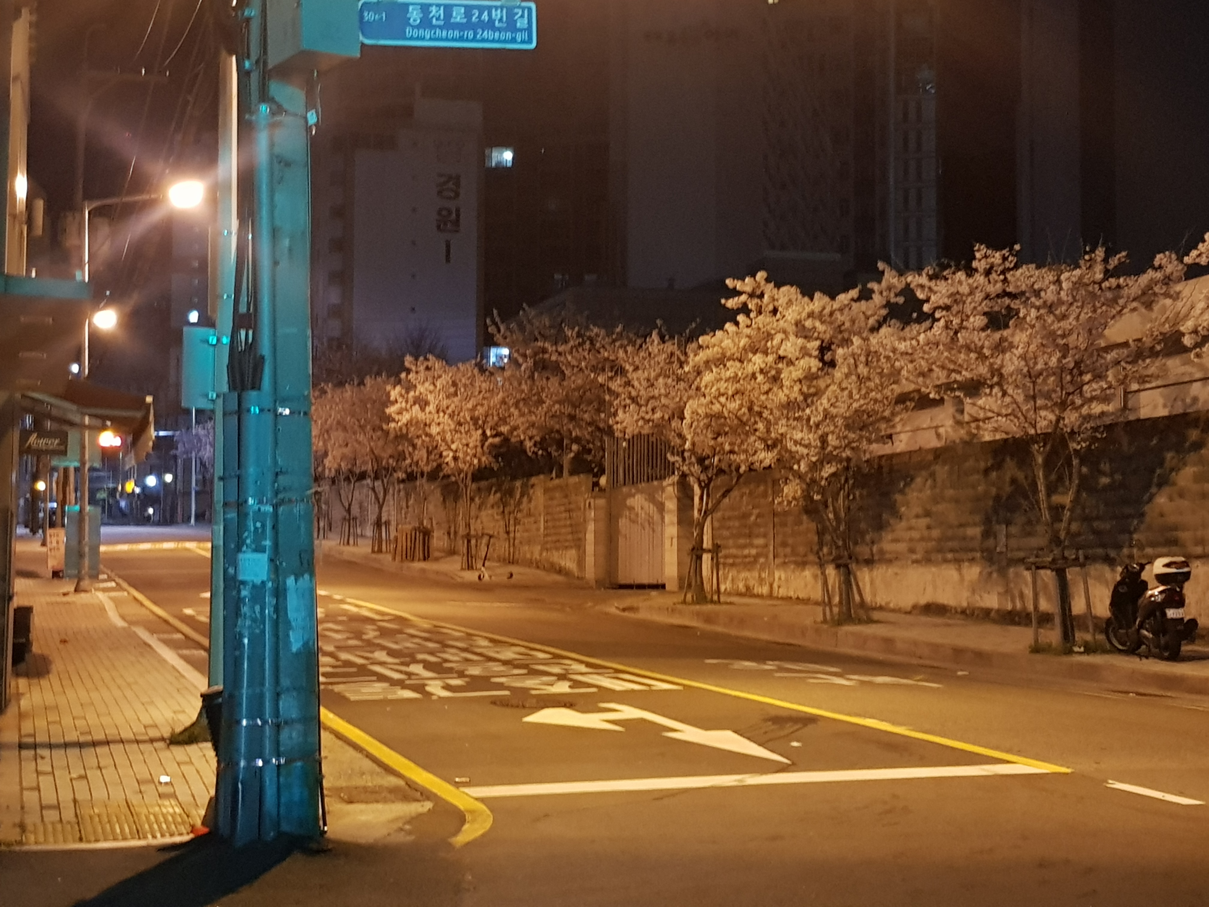 봄이 되어 핀 벚꽃이 엄청 이쁘다. 낮에 보는 것과는 다르게 새벽에 보는 또 다른 맛(?)이 있다.