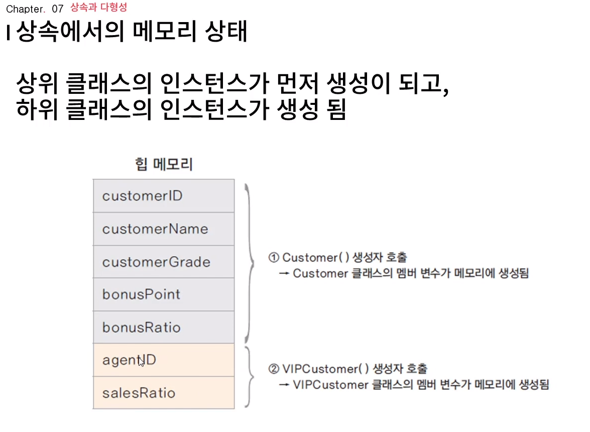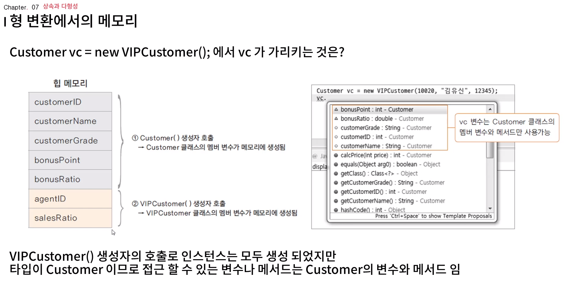 VIPCustomer() 생성자의 호출로 인스턴스는 모두 생성 되었지만 타입이 Customer이므로 접근 할 수 있는 변수나 메서드는 Customer의 변수와 메서드 임