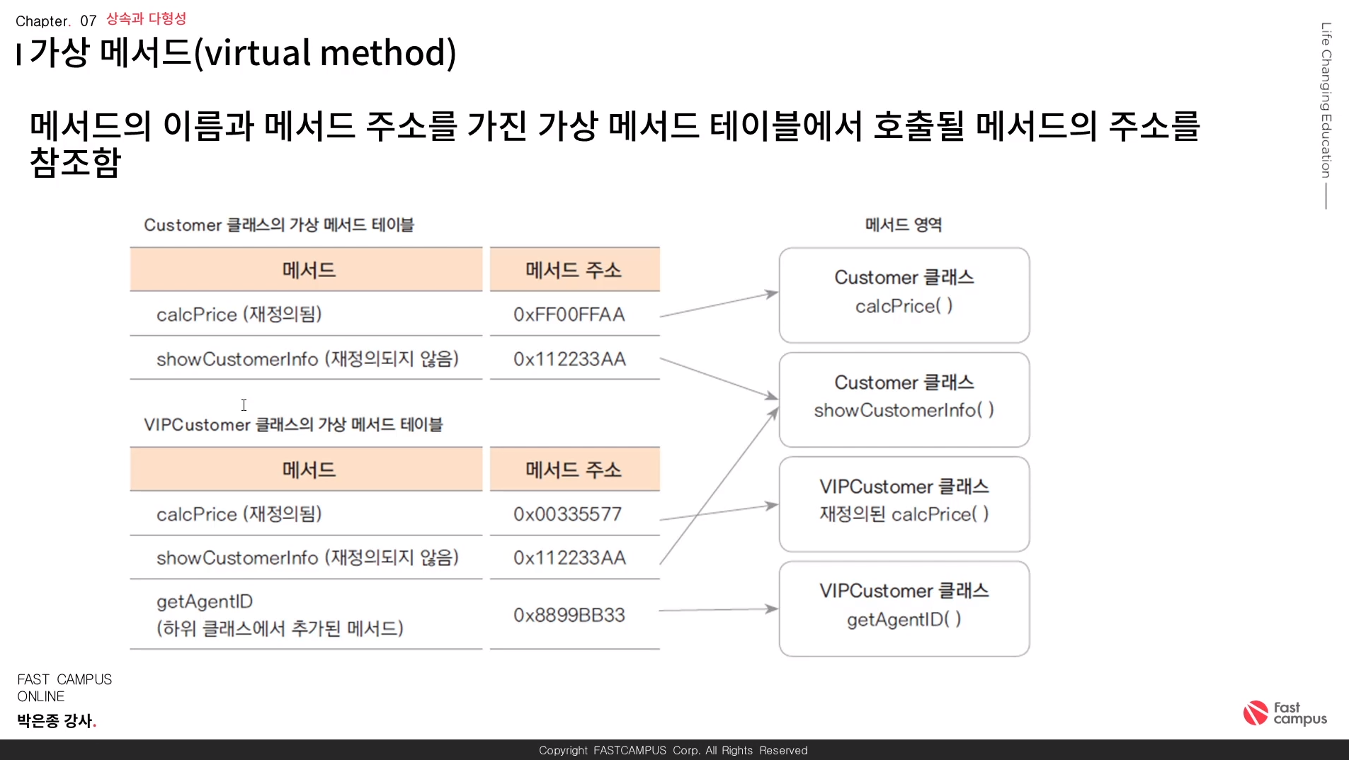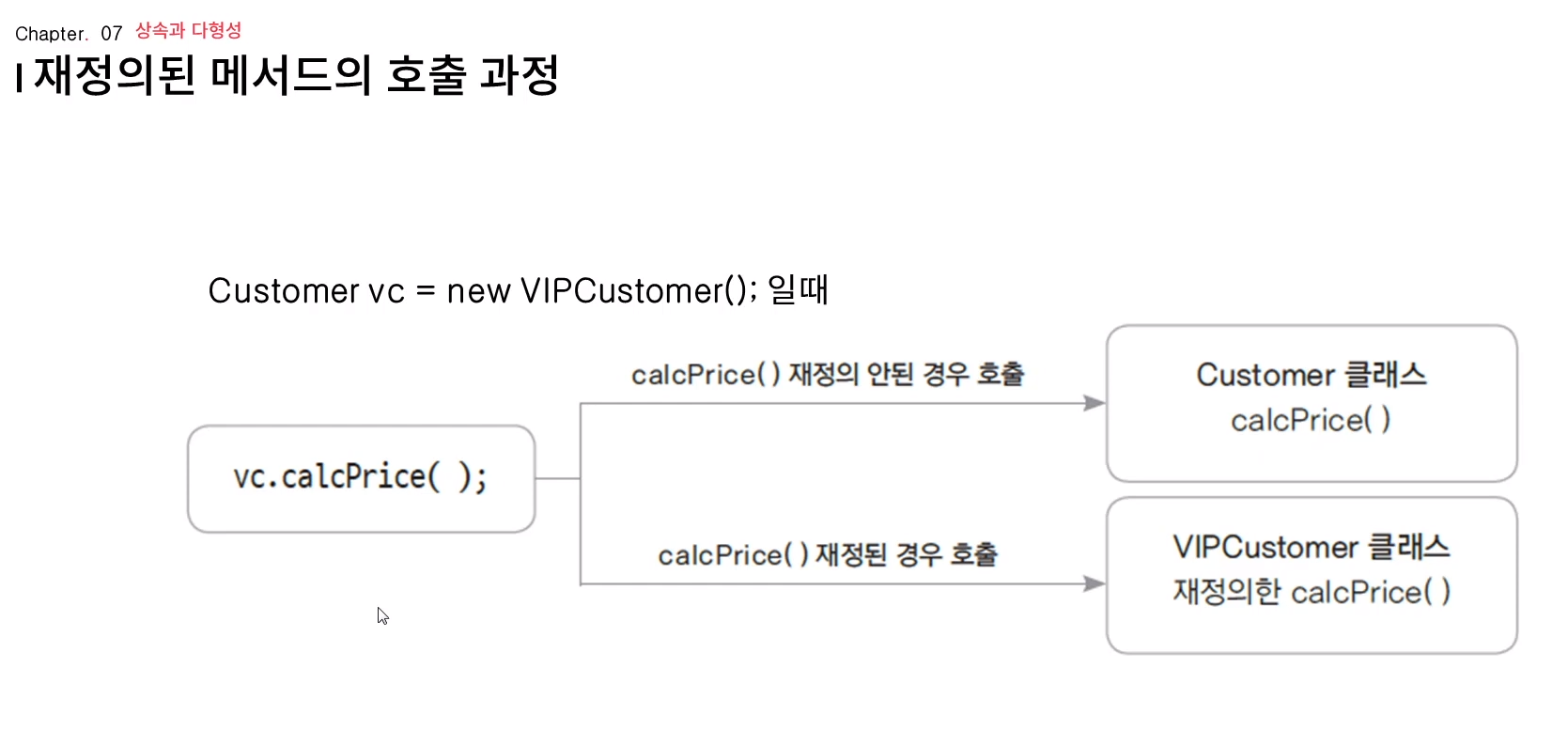 자바에서는 항상 인스턴스 (여기서는 VIPCustomer)의 메서드가 호출됨 << 가상 함수 (= 가상 메서드)