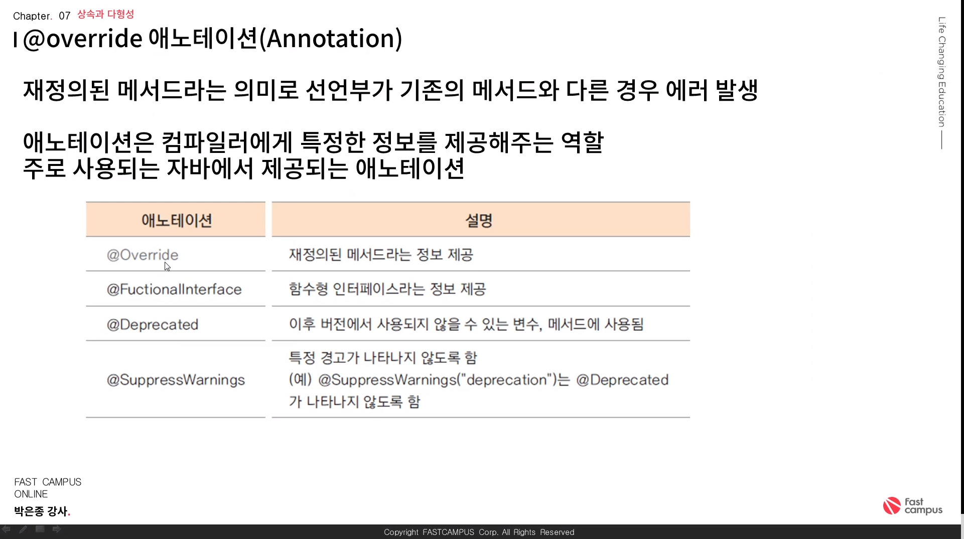 * 애너테이션 (@Override) << 컴파일러한에 오버라이딩된 거다 라고 의미를 정의하는것