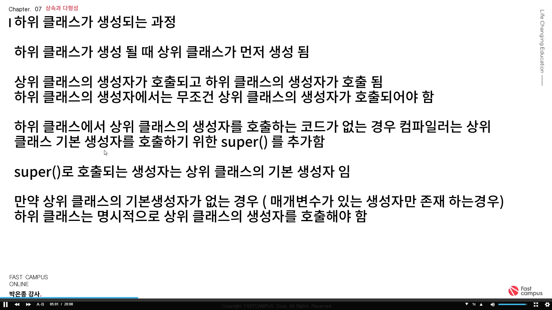 하위 클래스의 생성자에서는 무조건 상위 클래스의 생성자가 호출되어야 함