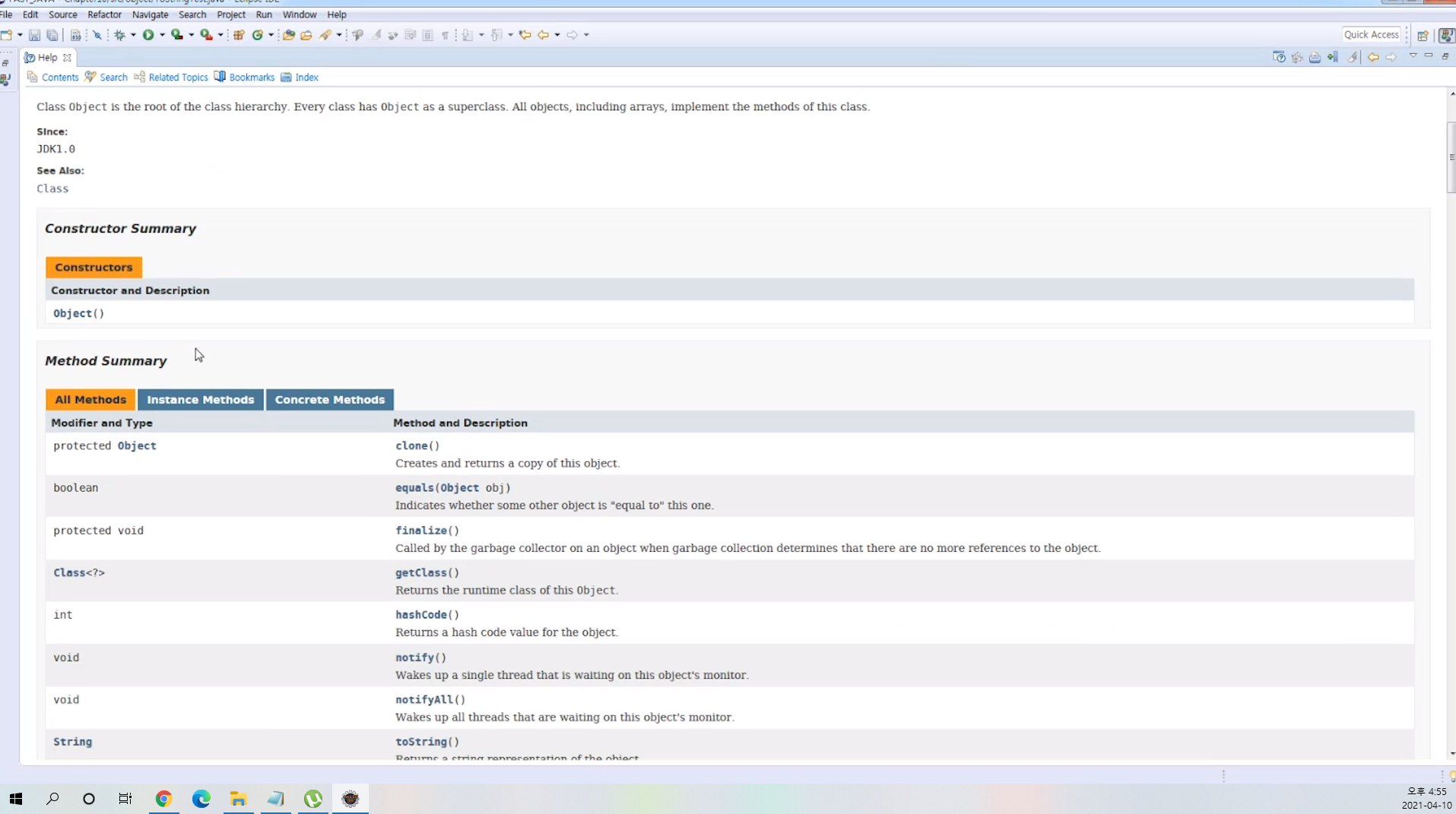 모든 클래스는 Object클래스의 일부 메서드를 재정의 하여 사용할 수 있음