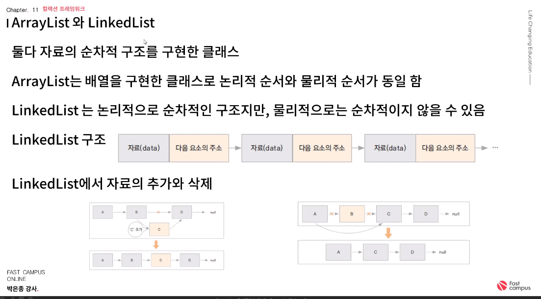ArrayList는 배열을 구현한 클래스로 논리적 순서와 믈리적 순서가 동일 함