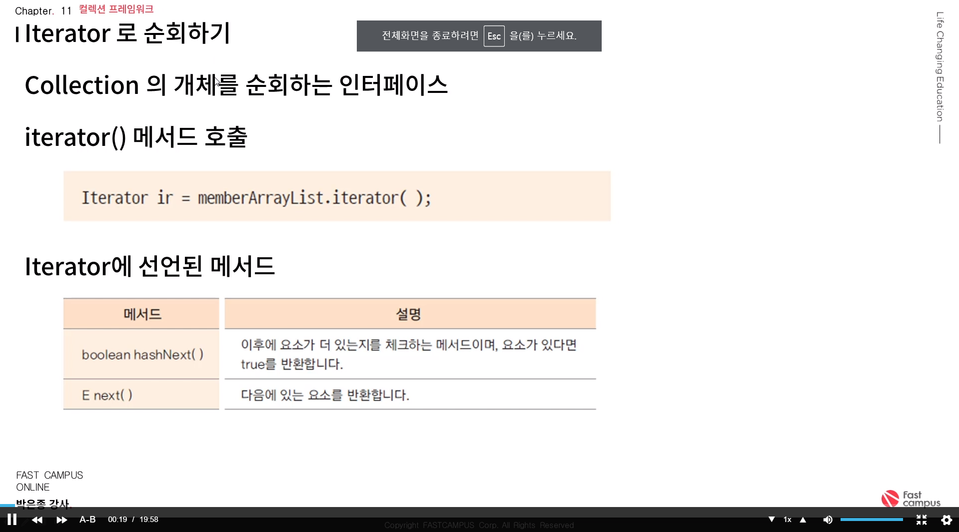 boolean hasNext() 이후에 요소가 더 있는지를 체크하는 메서드이며, 요소가 있다면 true를 반환합니다