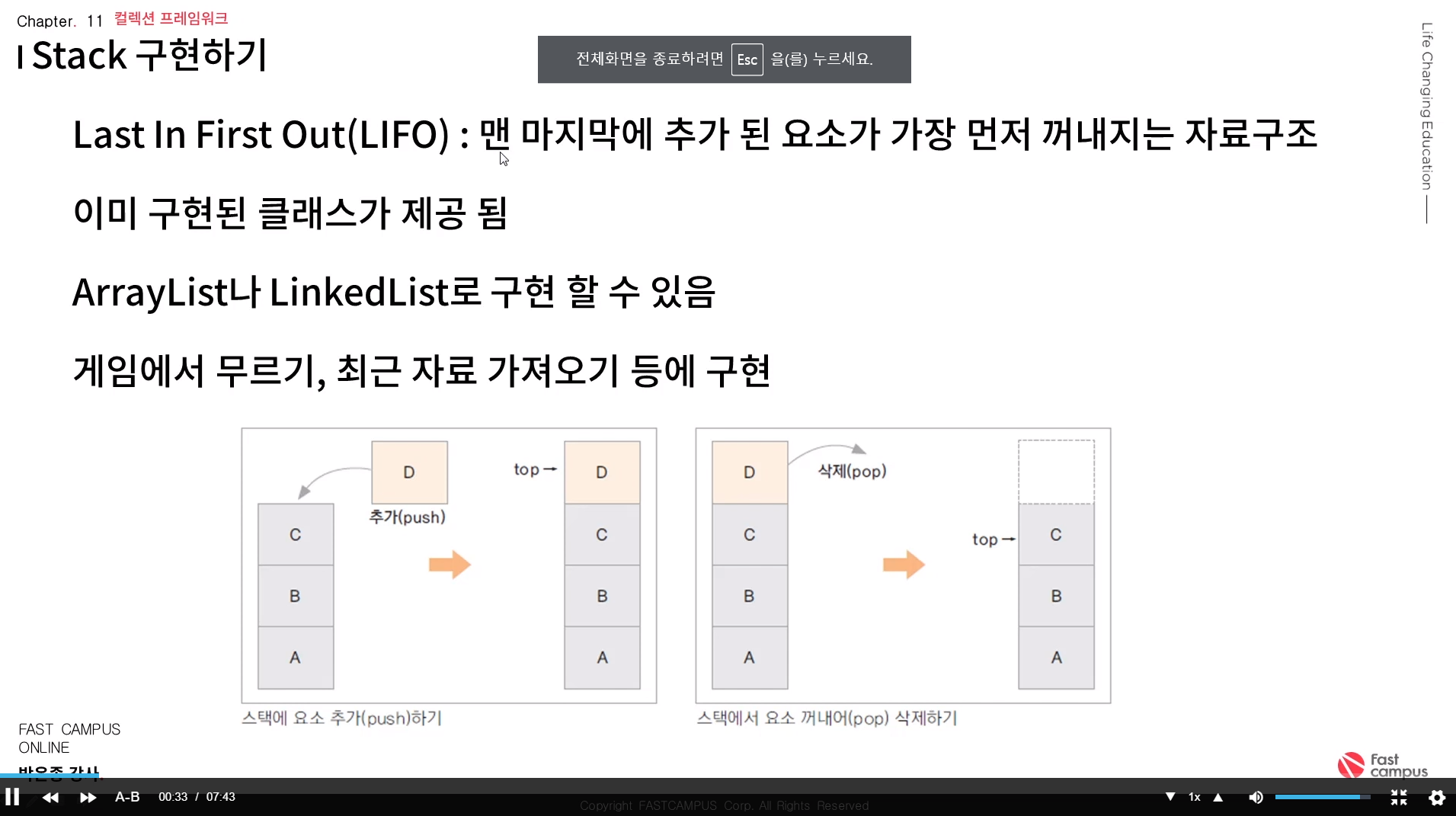 Last In First Out (LIFO) : 맨 마지막에 추가 된 요소가 가장 먼저 꺼내지는 자료구조