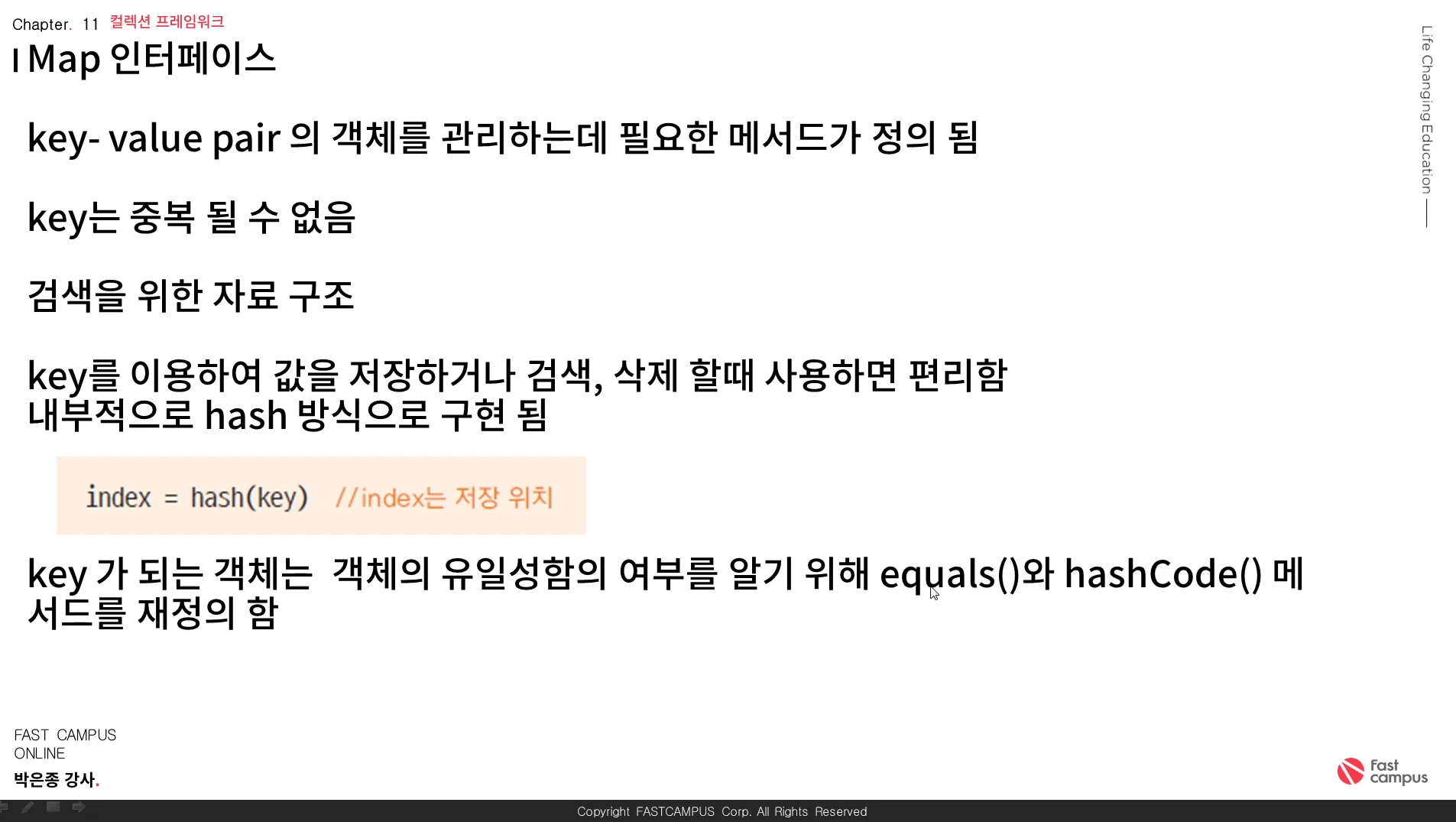 Key가 되는 객체는 객체의 유일성함의 여부를 알기 위해 equals()와 hashCode()메서드를 재정의 함